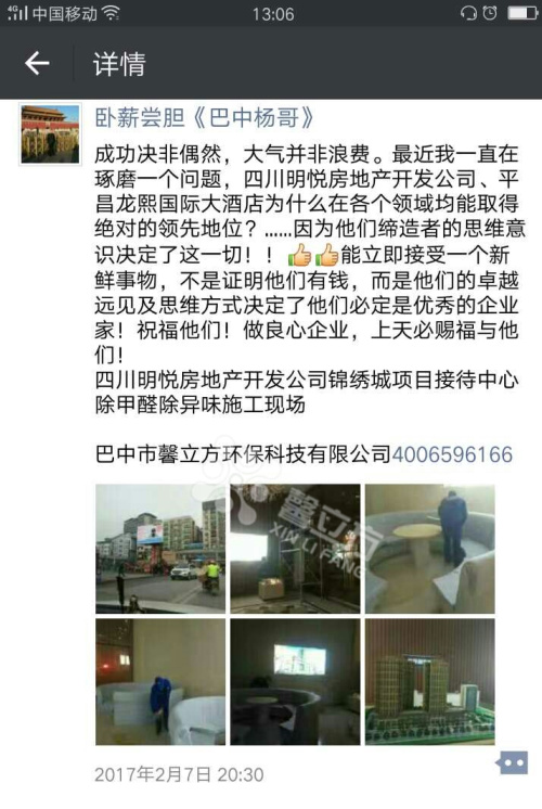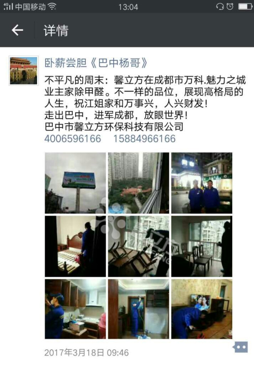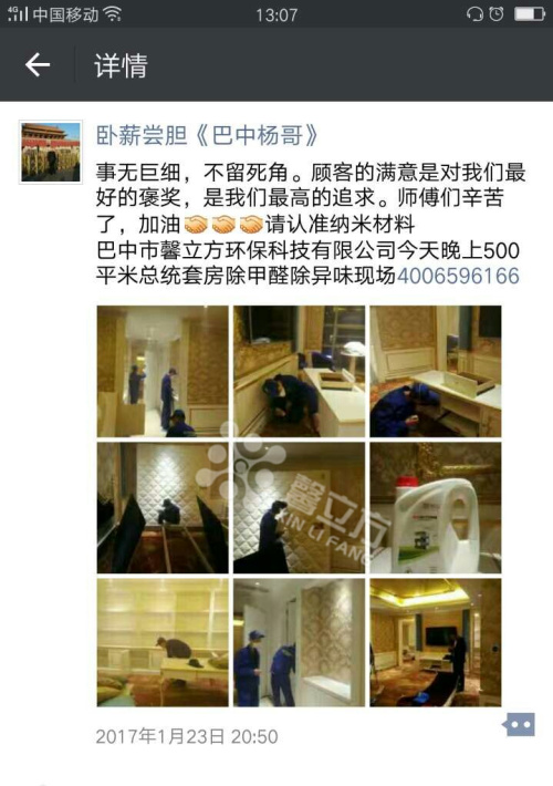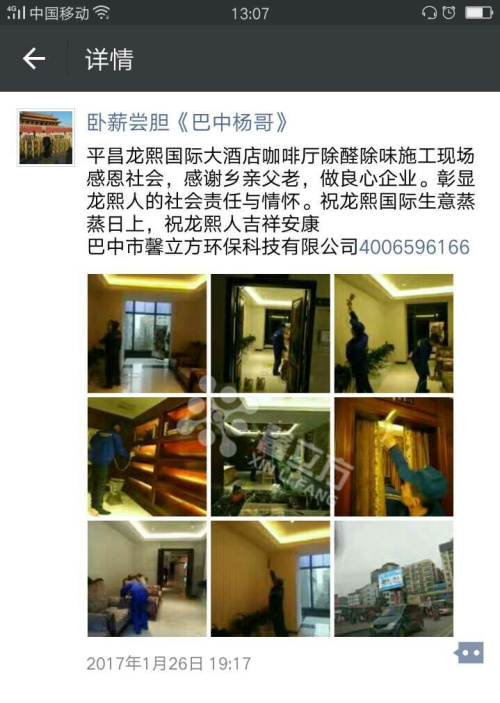 四川巴中加盟商楊總之所以能夠接觸到這個行業(yè),是因為他自己親身經(jīng)歷過甲醛的危害,在2016年11月楊總他們?nèi)野徇M了他們的新家,在剛剛搬進去一個多禮拜他的女兒臉上就起滿了紅疹,他們立刻就搬出去了,由于他本身是做建材,就立刻認識到是甲醛在搞鬼。于是就在本地尋找室內(nèi)甲醛環(huán)境治理,但是無果,當?shù)鼐椭挥协h(huán)保部門只為大型事業(yè)單位治理,不針對家庭私人的環(huán)境治理。根據(jù)多年的生意經(jīng)驗,馬上認識到了這里面的商機,隨后他就在網(wǎng)上看見了北京馨立方,經(jīng)過與加盟經(jīng)理一個多月的溝通交流,最終決定來北京總部進行實地考察,通過對現(xiàn)場家裝、工裝的的考察,現(xiàn)場治理效果明顯,在加上公司產(chǎn)品都是自主研發(fā),有技術保障,通過多方面的考察決定于北京馨立方合作。事實證明北京馨立方是經(jīng)得住時間檢驗的,不僅給他帶來了健康,也給他帶來了財富! 在加盟以后楊總通過推廣,使他的生意一點一點做的紅火起來,通過他的朋友圈就能感覺到他現(xiàn)在的生意是如火如荼!