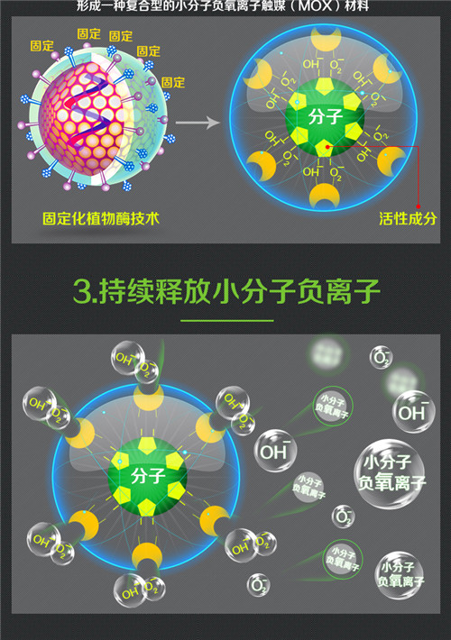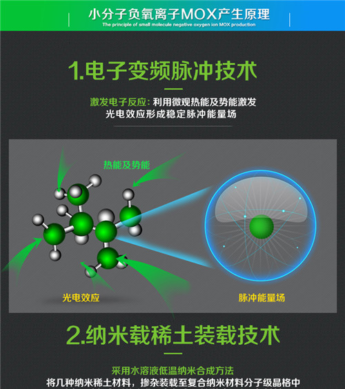 一、納米稀土裝載技術(shù): 采用水溶液低溫納米合成方法,將幾種納米稀土材料,摻雜裝載至復(fù)合納米材料分子級晶格中,形成一種復(fù)合型的小分子負(fù)氧離子觸媒(MOX)材料。 二、電子變頻脈沖技術(shù): 馨氧吧--小分子負(fù)氧離子觸媒(MOX)材料是一種微能量下即可獲得光生電子的躍遷,為分子電離提供了巨大的能量,促使與其“孿生的負(fù)離子粒子”產(chǎn)生微觀上的振動,加之負(fù)離子材料熱電性和壓電性引起成分晶體之間的靜電高達(dá)100萬電子伏特的電勢差,從而使空氣發(fā)生電離,被擊中的電子附著于鄰近的水和氧氣分子并使它轉(zhuǎn)化為空氣負(fù)離子,因此在這種體系中就會不斷釋放負(fù)離子。