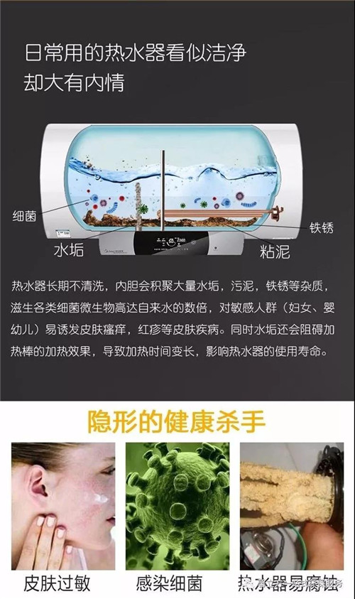 4、電熱水器更需要定期清洗,如果過長時間不進行深度清洗保護,長期處于高溫中會與不銹鋼、鋁等物質(zhì)發(fā)生化學反應,產(chǎn)生有害物質(zhì)(含鐵、鋁、銨等的亞硝酸鹽、重金屬、砷化物等),且濃度會不斷提高。這些有害物質(zhì)容易造成皮膚過敏,引發(fā)各種皮膚病 。而且不清洗會縮短熱水器使用壽命。例如當內(nèi)膽結(jié)有3毫米厚的水垢時,鋼材溫度會由280℃上升到580℃,而抗拉強度則由40公斤力/mm2下降到10公斤力/mm2,從而導致內(nèi)膽過熱變形、鼓包、甚至破裂。